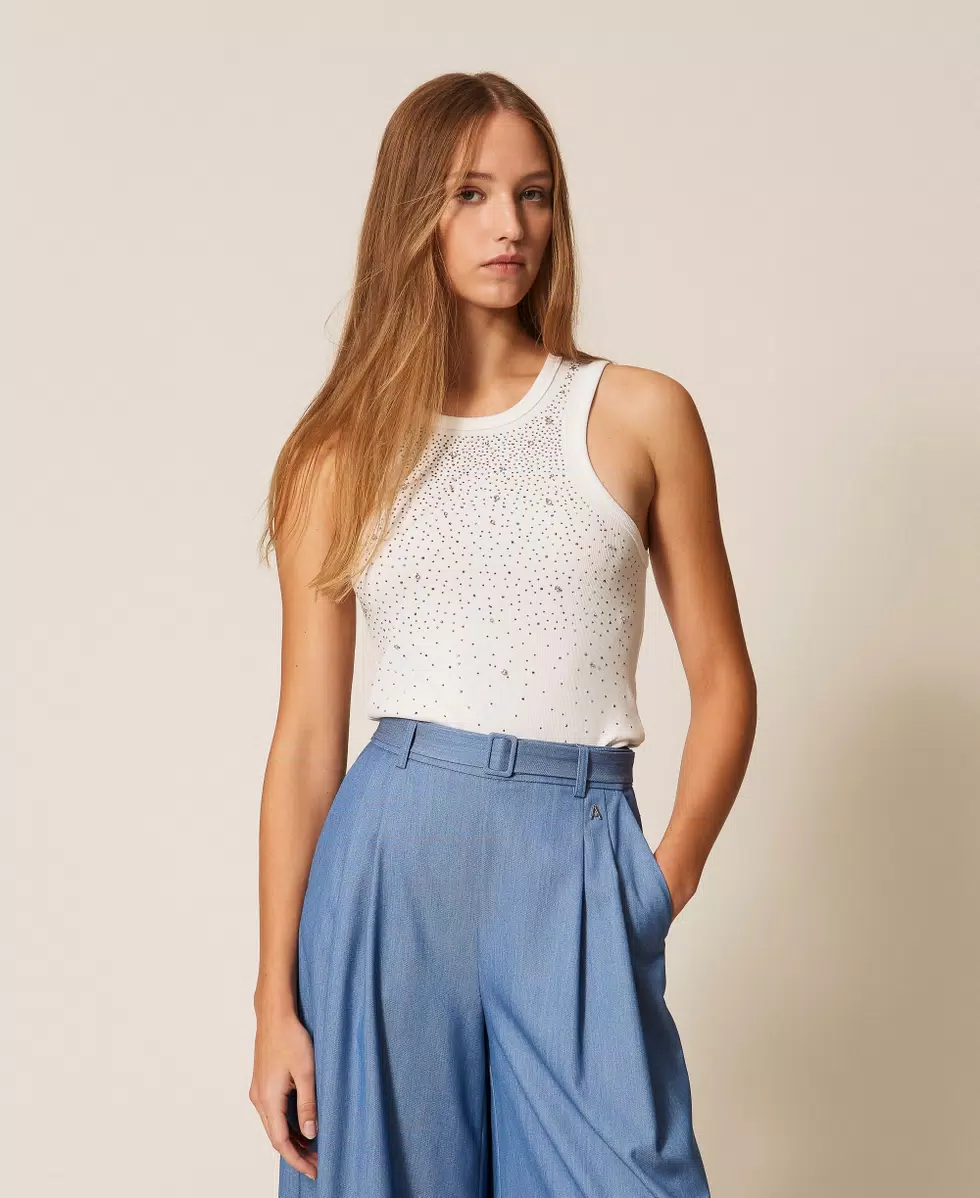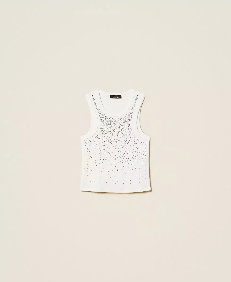 Top collezione Actitude in misto cotone lavorato a costine con applicazioni di termoadesivi e castoni ricamati a mano in dégradé. Ha collo tondo e linea fitted.