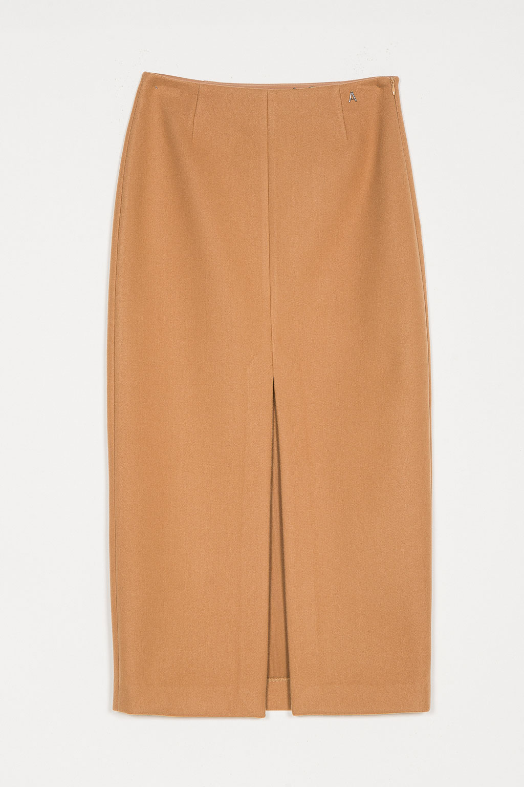 Gonna longuette in panno con spacco ampio sul davanti, linea dritta, zip laterale, placchetta del logo in vita.