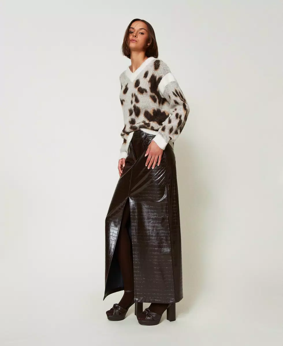Gonna lunga effetto pelle a stampa coccodrillo con ampio spacco al centro davanti. Ha la chiusura con gancio e zip, cinque tasche davanti con filetti sul retro, linea dritta.
