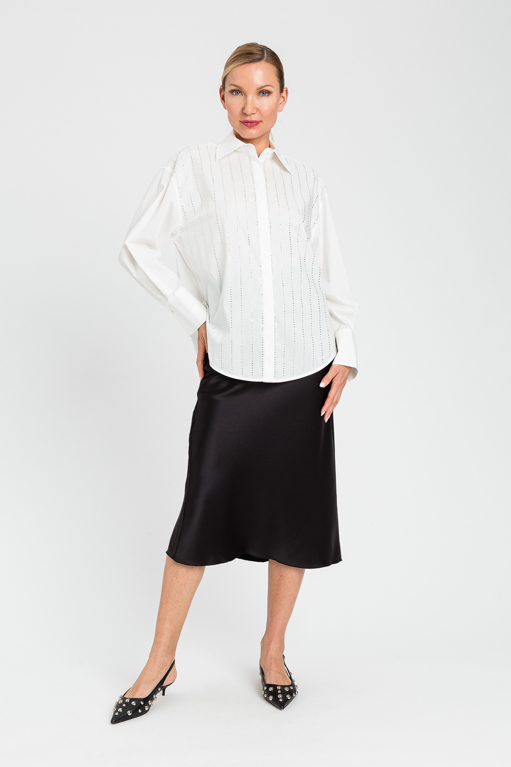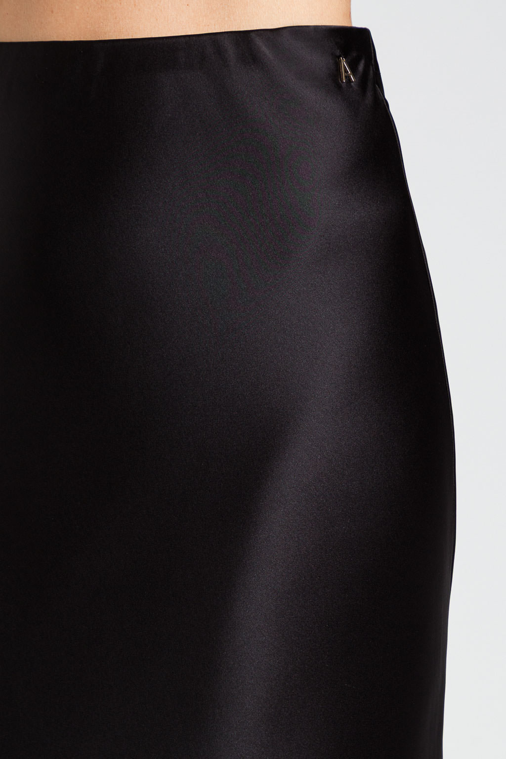 Gonna lunga collezione Actitude in raso tagliata in sbieco che abbraccia la silhouette. Ha elastico in vita e linea dritta.