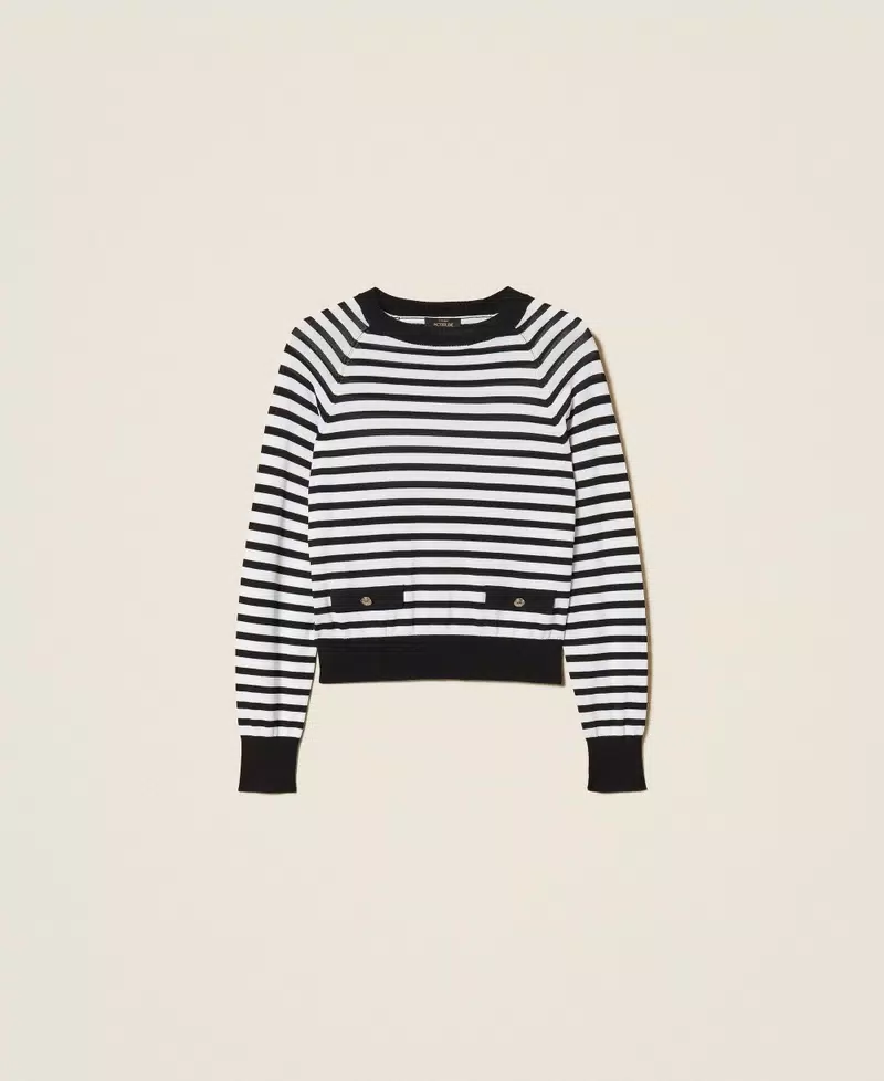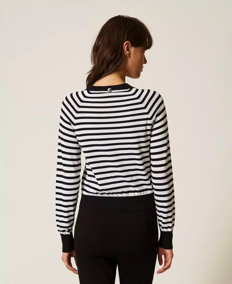 Maglia collezione Actitude in misto viscosa a righe con profili rifiniti a tinta unita. Ha girocollo, maniche lunghe, patte davanti con bottoni logati, linea fitted.