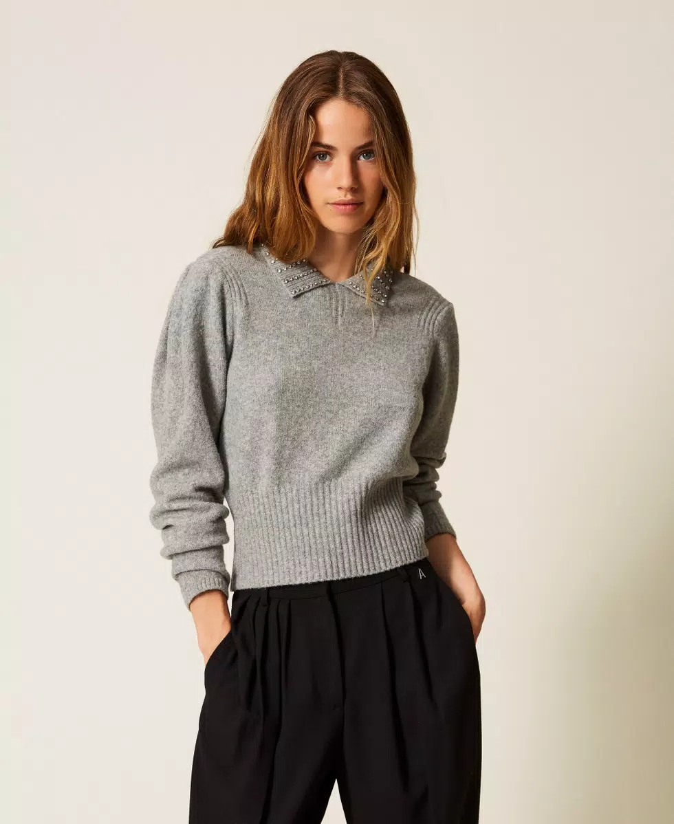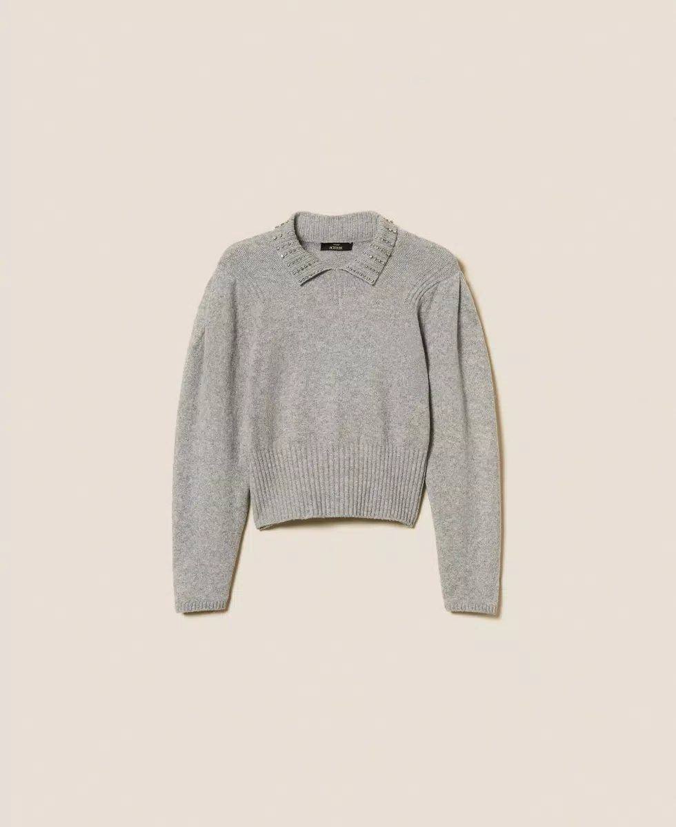 Maglia collezione Actitude Revive in filato riciclato (50% di poliestere riciclato) con colletto a polo e applicazione di cabochon. Ha maniche lunghe, placchetta logo sul fianco e linea dritta. Il modello fa parte del conscious program Revive di Actitude by Twinset.