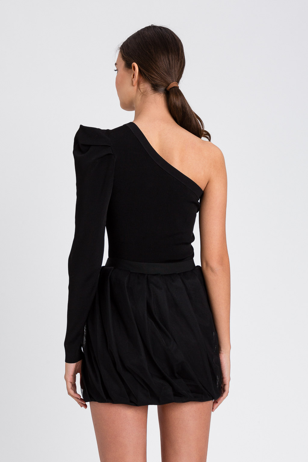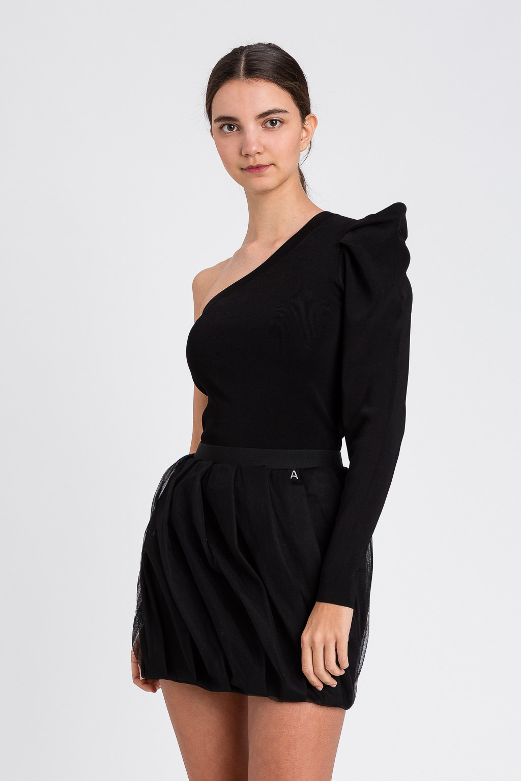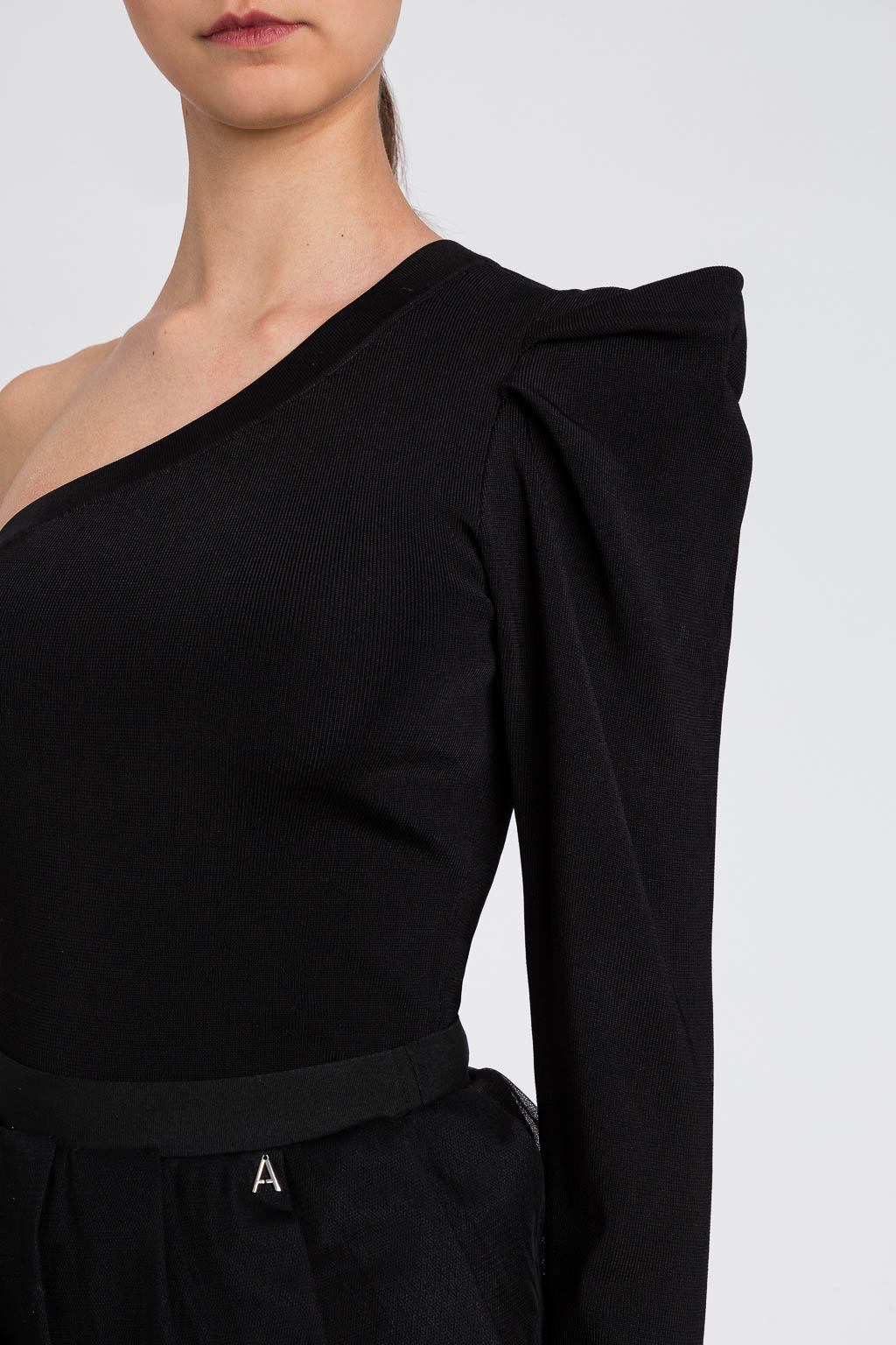 Maglia monospalla in maglina di viscosa con manica a sbuffo. Composizione: 81% viscosa, 19% poliammide.