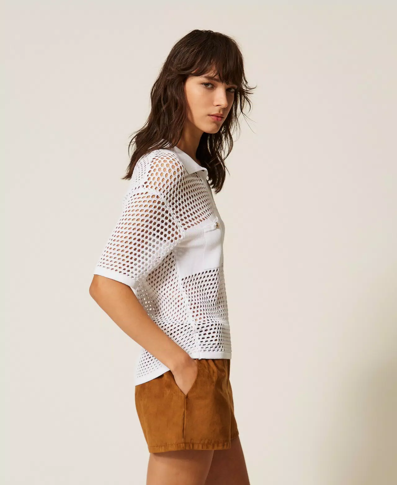 Maglia a polo collezione Actitude in misto viscosa con fascia rasata al centro. Ha lavorazione a rete, colletto con bottone al collo, maniche corte, tasche con bottoni logati, linea morbida.