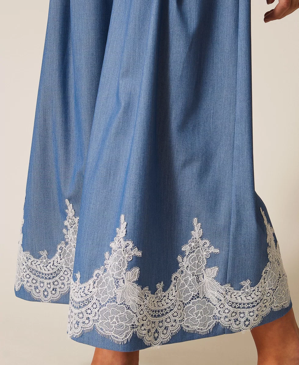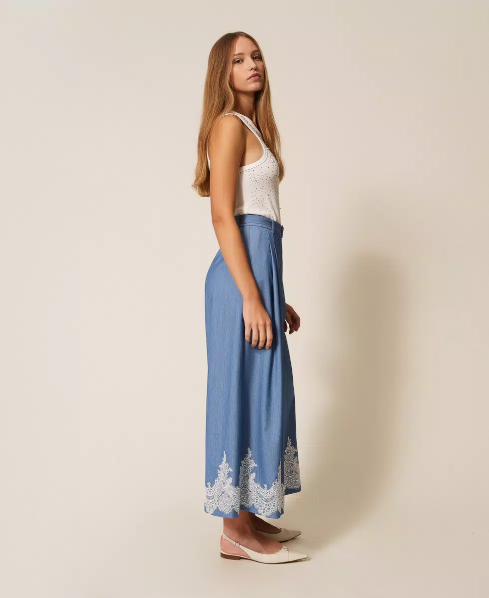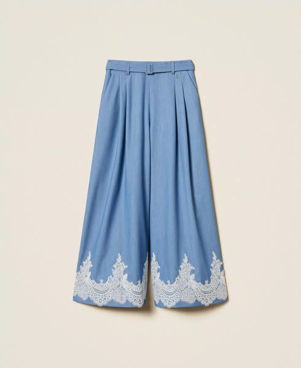 Pantaloni collezione Actitude in tessuto fluido di misto viscosa con pizzo a contrasto applicato al fondo. Hanno doppia pinces davanti, chiusura con zip al fianco, tasche alla francese, cintura in coordinato con fibbia passante, linea a palazzo.