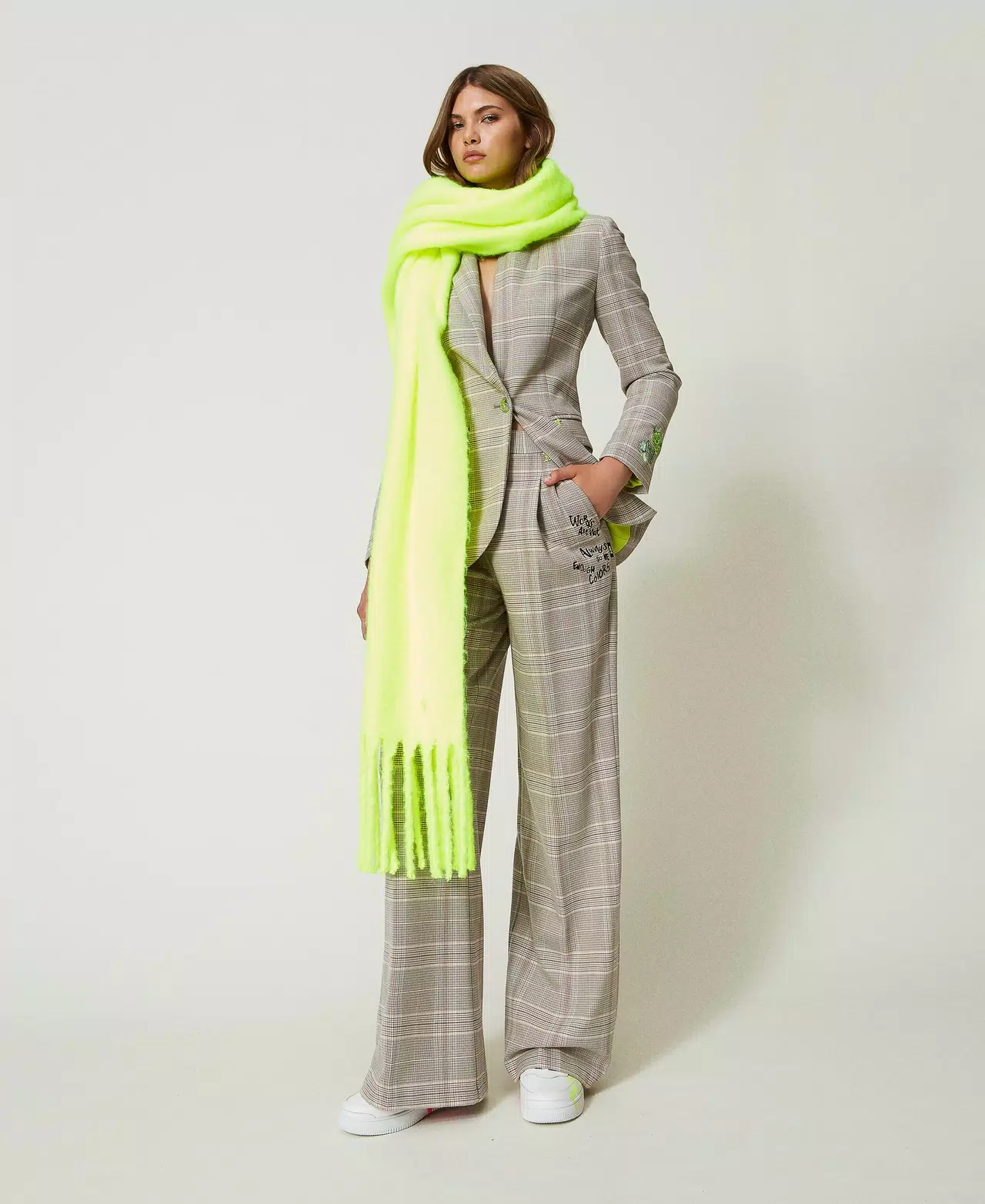 Sciarpa Limited Edition firmata dall'artista MYFO in tessuto ultra soft, con frange al fondo e personalizzazione logo laccata in contrasto in colori fluo.