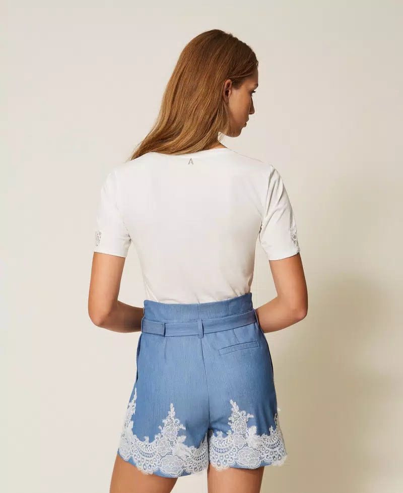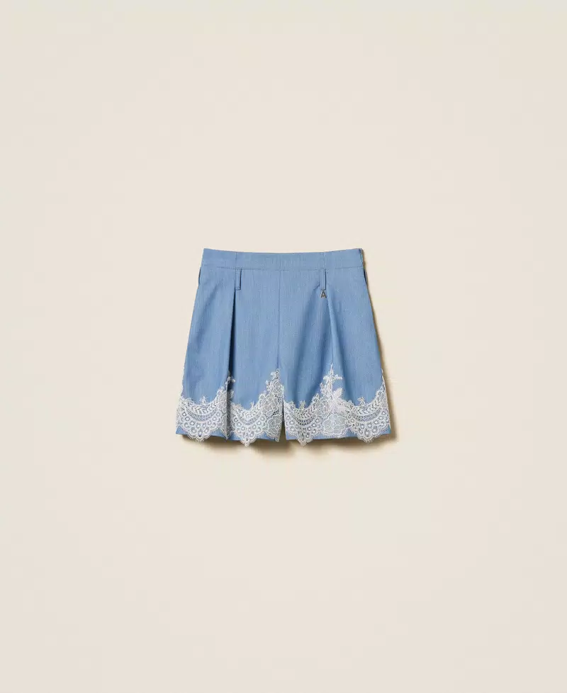 Shorts collezione Actitude in tessuto fluido di misto viscosa con pizzo a contrasto applicato al fondo. Ha pinces davanti, chiusura con zip al fianco, tasche alla francese, cintura in coordinato con fibbia passante, linea morbida.