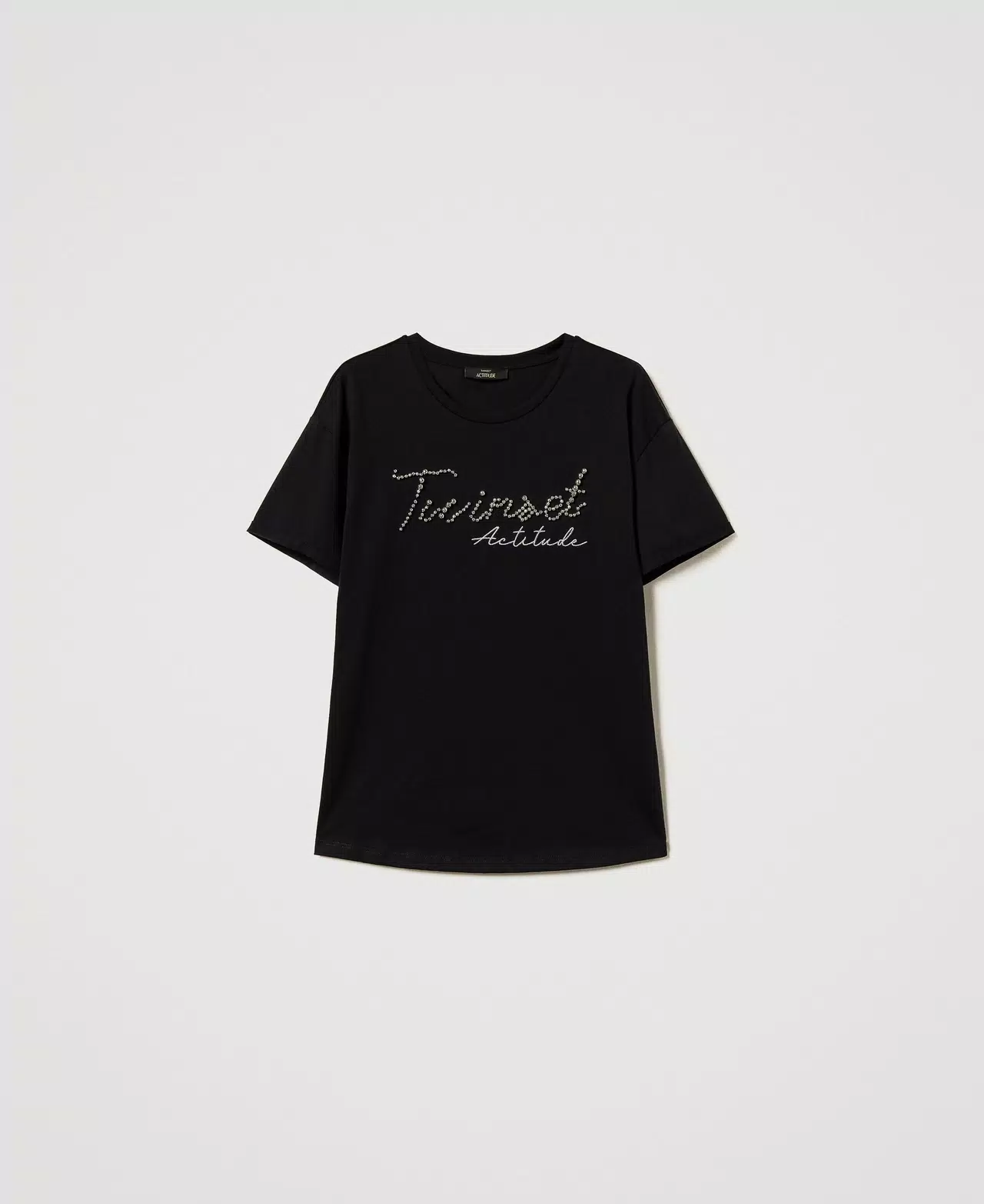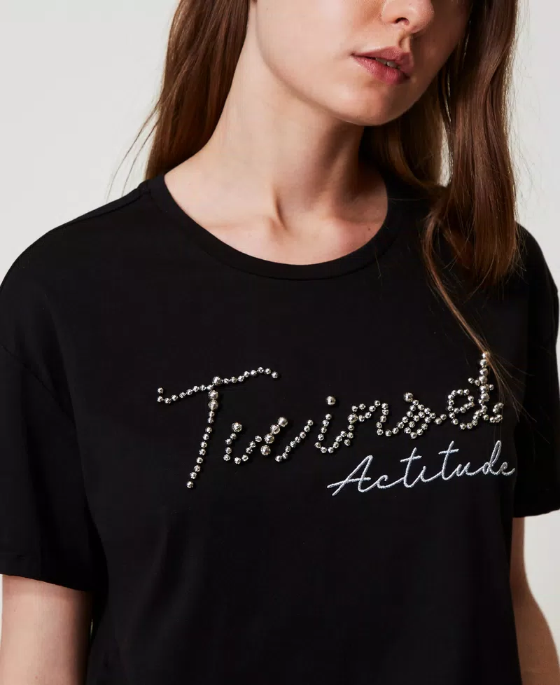 T-shirt collezione Actitude in jersey di cotone con logo ricamato a mano in filo di lurex e perline. Ha scollo tondo, maniche corte e linea morbida.