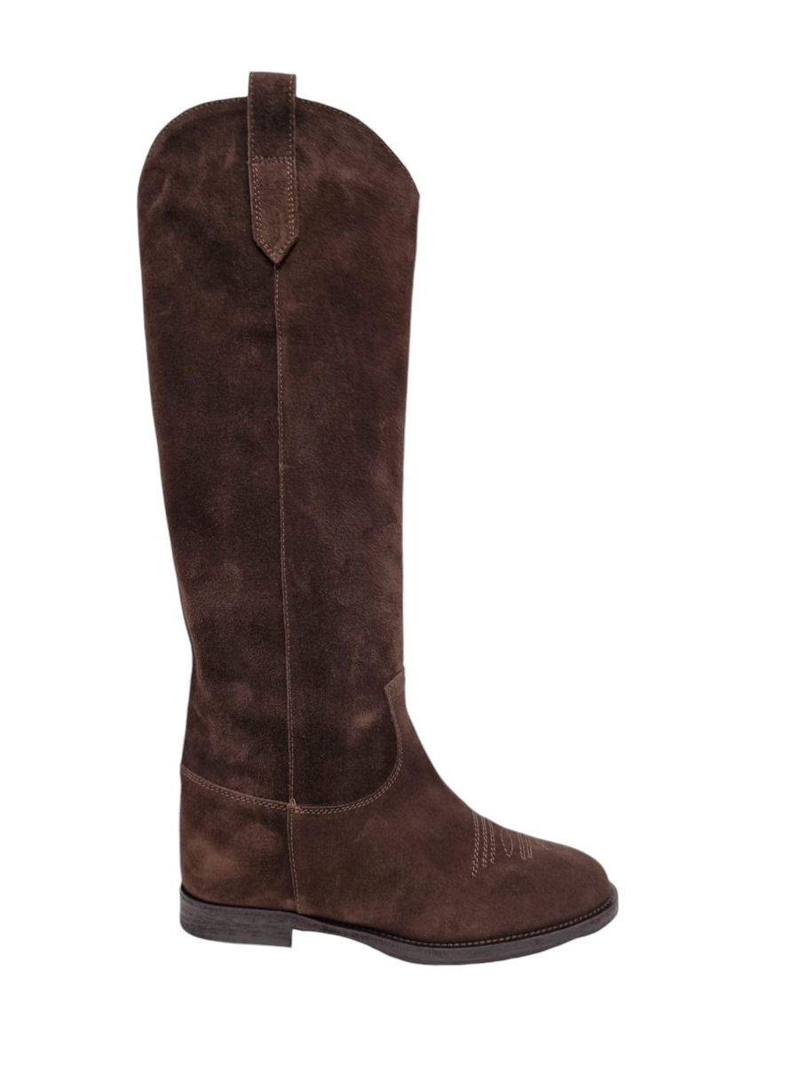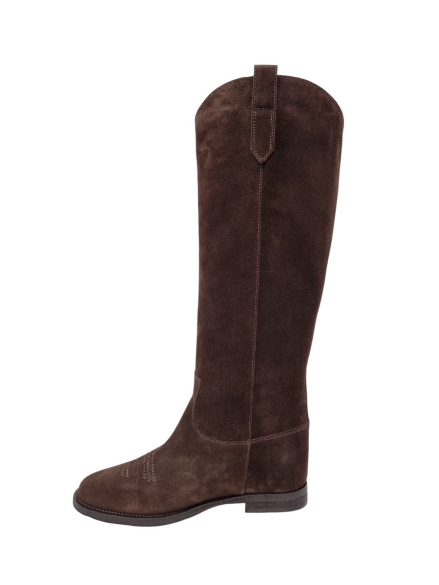 Stivale Via Roma 15 scamosciato color moro, gambale alto stile texano, cuciture decorative sulla punta, zeppa interna da 3,5cm.